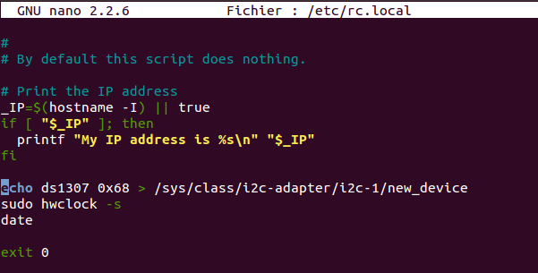 Activation au démarrage. Nous éditons le fichier : sudo nano /etc/rc.local et on rajoutes les lignes suivantes :