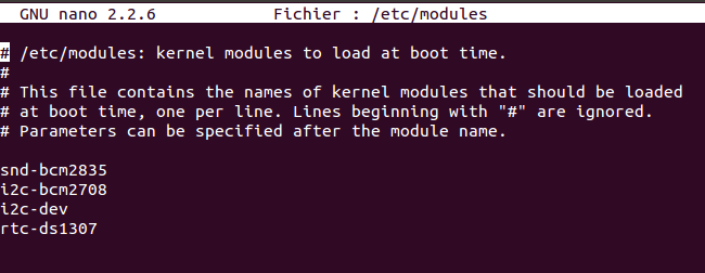 Editons le fichier sudo nano /etc/modules et ajoutons la ligne rtc-ds1307.